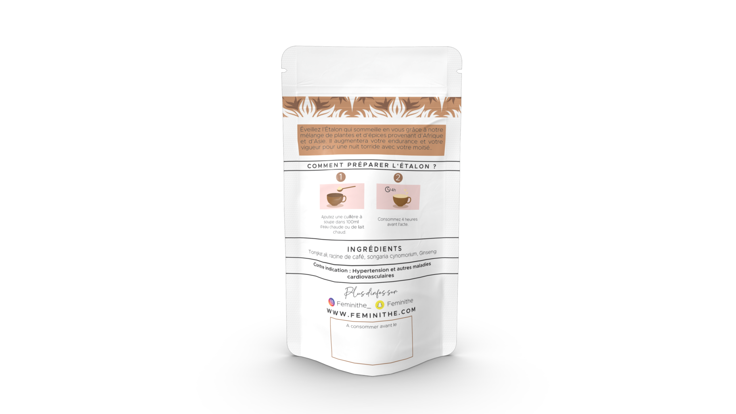 Ingrédients: L’Etalon contient du café mélangé avec le Tongkat Ali, la racine de café de l’himalaya, la plante de Songaria Cynomorium et le ginseng qui vous donneront l’avantage supplémentaire d’un mode de vie sain et actif.